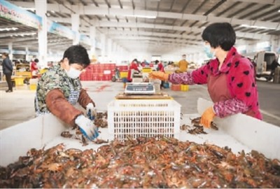 走進(jìn)湖北潛江小龍蝦交易中心,眼前一派忙碌景象。500多家水產(chǎn)商戶已經(jīng)復(fù)工,工人們忙著分揀包裝,成箱的小龍蝦被裝上物流車輛,運(yùn)往全國(guó)各地。