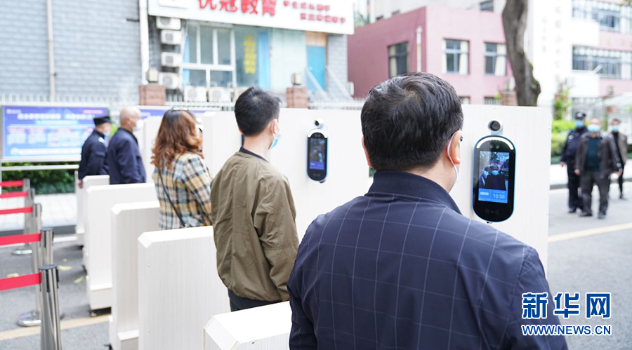 在重慶市第一中學,大校門設置了多條紅外線成像體溫測控通道,能夠快速檢測到師生體溫并清楚顯示。學生從通道經(jīng)過時,紅外線測溫儀會及時監(jiān)測通過者體溫,若有體溫異常者,設備會報警。圖為學校老師演習進校場景。新華網(wǎng)發(fā)