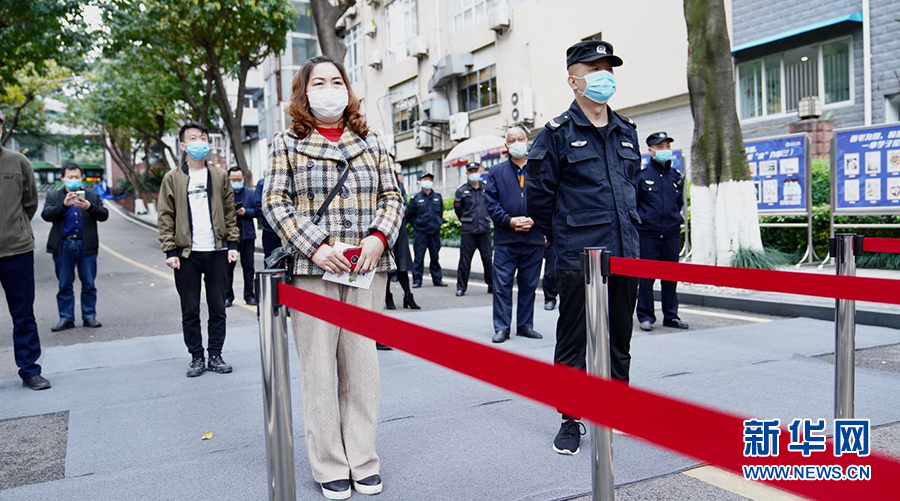 在重慶市第一中學,學生返校時須由值班人員引導指揮,在校門外有序排隊,相互間保持一米的距離,并從專用通道依次有序進入。圖為學校老師演習進校場景。新華網(wǎng)發(fā)