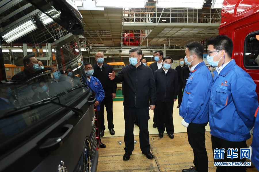 22日,習(xí)近平在西安考察復(fù)工復(fù)產(chǎn)和經(jīng)濟社會恢復(fù)運行等情況。陜西汽車控股集團有限公司是西北地區(qū)有影響力的制造企業(yè)。習(xí)近平詳細(xì)了解產(chǎn)品研發(fā)、生產(chǎn)、銷售和復(fù)工復(fù)產(chǎn)情況,對他們克服疫情影響創(chuàng)產(chǎn)銷歷史新高表示贊賞??傃b車間內(nèi)一片繁忙景象。習(xí)近平察看內(nèi)飾生產(chǎn)線、總裝配生產(chǎn)線,饒有興致登上裝配完成的民用重型卡車駕駛室,向技術(shù)人員詢問產(chǎn)品性能和操作流程。習(xí)近平強調(diào),制造業(yè)是國家經(jīng)濟命脈所系。國有大型企業(yè)要發(fā)揮主力軍作用,在抓好常態(tài)化疫情防控的前提下,帶動上下游產(chǎn)業(yè)和中小企業(yè)全面復(fù)工復(fù)產(chǎn)。習(xí)近平指出,新時代陜西要有勇立潮頭、爭當(dāng)時代弄潮兒的志向和氣魄,既要抓住西部大開發(fā)、共建“一帶一路”等重大機遇,又要善于從眼前的危機和挑戰(zhàn)中搶抓和創(chuàng)造機遇,不斷發(fā)展新模式、新業(yè)態(tài)、新技術(shù)、新產(chǎn)品,創(chuàng)造新的更大業(yè)績,邁上新的臺階。