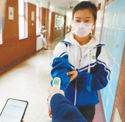 “先找到班級固定位置,根據(jù)地面標記有間隔地排隊。”寧珂菡熟練地向記者介紹,“挨個進入值班室后,面朝機器進行人臉識別,然后登記信息、測量體溫,一切正常才能入校。”