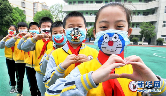 5月8日,安徽省安慶市迎江區(qū)華中路第二小學(xué)在操場(chǎng)上開(kāi)展手繪“微笑口罩”創(chuàng)意活動(dòng),通過(guò)讓孩子們手繪各式笑臉并貼到口罩上的方式,引導(dǎo)學(xué)生培養(yǎng)健康樂(lè)觀的心態(tài)。 當(dāng)日是世界微笑日。 新華社發(fā)(黃有安 攝)