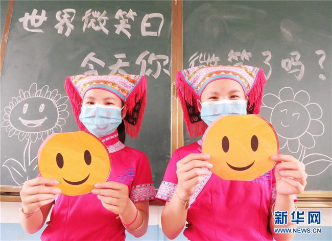 5月8日,在湖南省江永縣蘭溪瑤族鄉(xiāng)學(xué)校六年級(jí)一班,一對(duì)雙胞胎姐妹在展示自制的笑臉卡。 當(dāng)日是世界微笑日。 新華社發(fā)(田如瑞 攝)