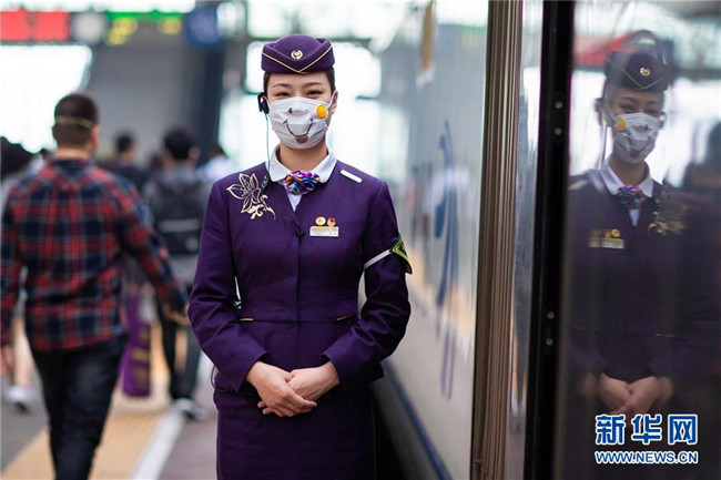5月8日,在南京火車(chē)站站臺(tái)上,一名列車(chē)員戴著“笑臉口罩”迎接旅客上車(chē)。 當(dāng)日是世界微笑日。 新華社發(fā)(蘇陽(yáng) 攝)