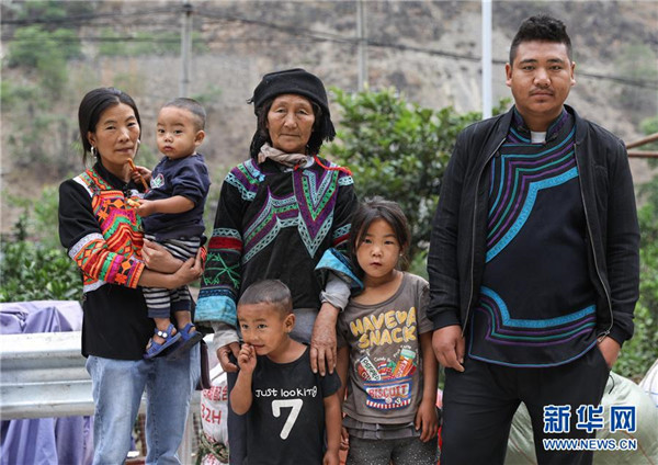 5月12日,四川省昭覺(jué)縣阿土列爾村第一批26戶貧困戶開(kāi)始搬新家,莫色石波一家6口在山下公路邊合影留念。