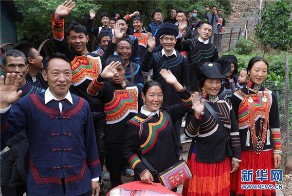 5月12日,四川省昭覺(jué)縣阿土列爾村第一批26戶貧困戶坐上開(kāi)往昭覺(jué)縣易地扶貧搬遷縣城集中安置點(diǎn)的新家,與其他村民道別。新華社記者江宏景攝