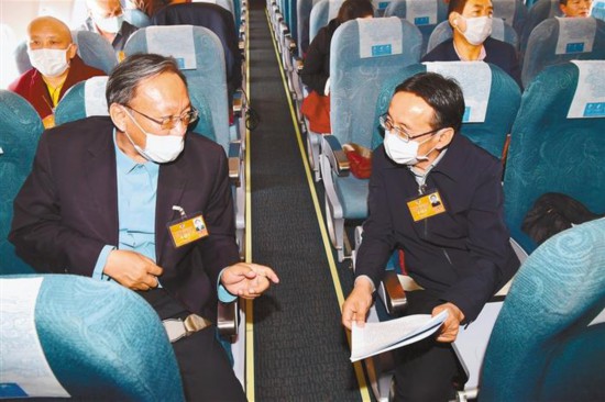 5月20日,全國(guó)政協(xié)委員、西藏人民醫(yī)院副院長(zhǎng)格桑羅布(左)與全國(guó)政協(xié)委員、西藏大學(xué)科研處處長(zhǎng)圖登克珠在前往北京途中就如何在全國(guó)兩會(huì)上建言獻(xiàn)策、履職盡責(zé)進(jìn)行交流。本報(bào)記者 旦增西旦 攝