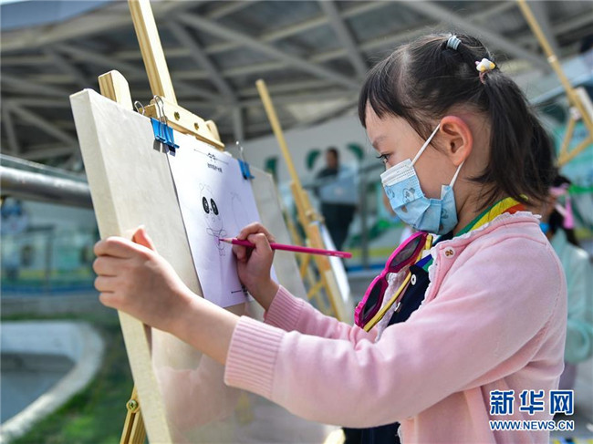 5月31日,小朋友在西寧熊貓館內(nèi)繪畫。 新華社記者 張龍 攝