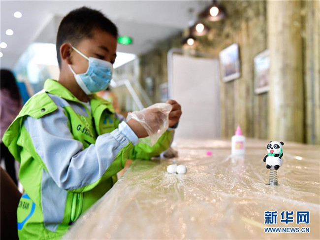 5月31日,小朋友在西寧熊貓館內(nèi)制作熊貓擺件。 新華社記者 張龍 攝