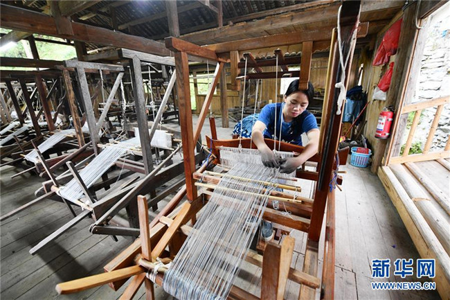楊成蘭在合作社的扶貧車間里織布(5月28日攝)。新華社記者 楊文斌 攝