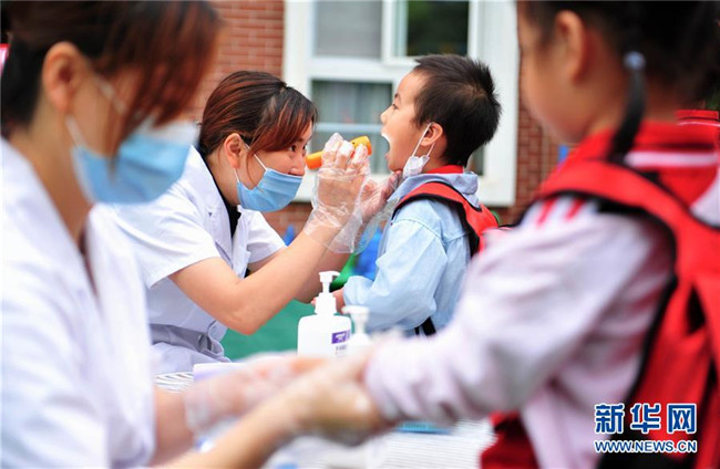 6月2日,成都市龍泉驛區(qū)明慧家美育幼兒園恢復(fù)開園,小朋友們在接受入園體檢。 新華社發(fā)(胥冰潔攝)
