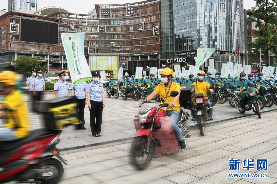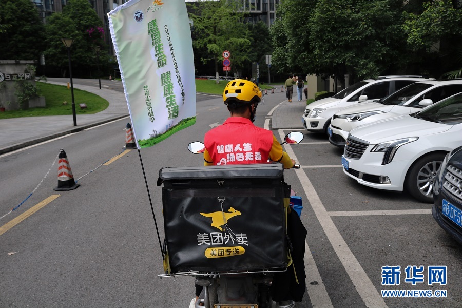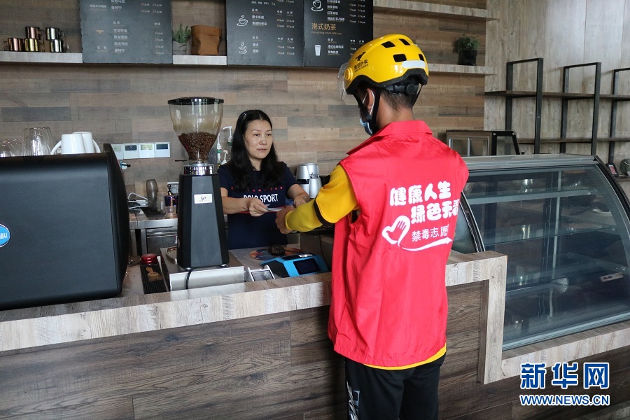 送完這一單后,周歡匆匆趕往下一個(gè)送餐點(diǎn)。“未來,將有更有人在點(diǎn)外賣時(shí),不僅會(huì)收到美食,還會(huì)收獲一份特殊的‘禁毒外賣’”。新華網(wǎng)發(fā) (滕華 攝)