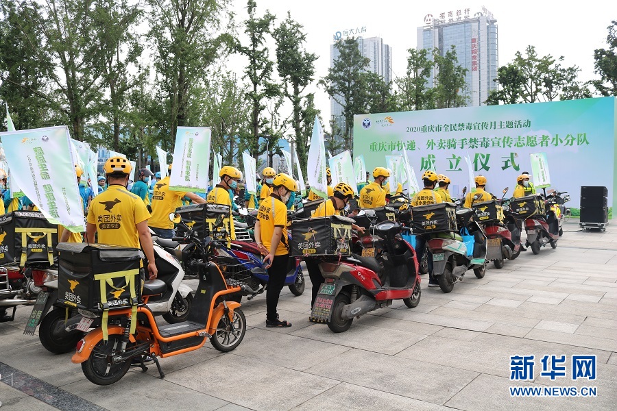 重慶市快遞、外賣騎手禁毒宣傳志愿者小分隊(duì)成立。新華網(wǎng)發(fā) (滕華 攝)