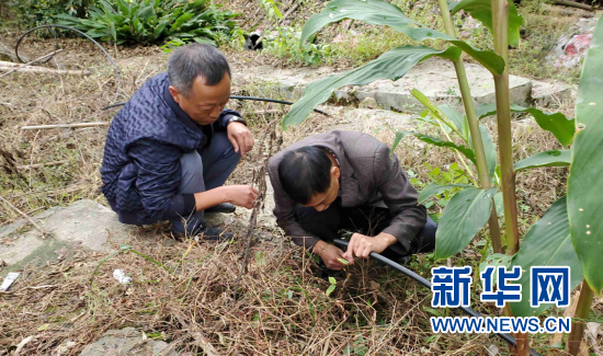 張紹淦(左一)在山上檢查自來水管道。新華網(wǎng)發(fā)(重慶稅務(wù)供圖)