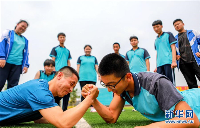 6月22日,河北省邯鄲市邯山區(qū)第一中學(xué)的高三學(xué)生和老師進行“掰手腕”游戲。 新華社記者 王曉 攝