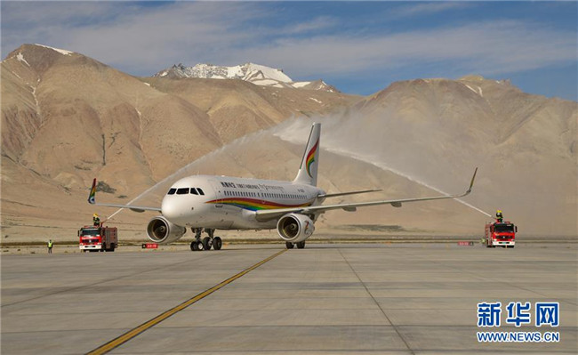 7月1日,西藏航空TV6008客機降落阿里昆莎機場穿過水門。 新華社記者 田金文 攝