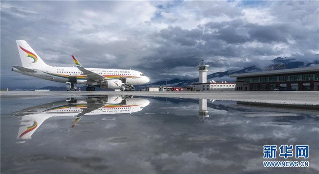 7月1日,阿里昆莎機場地面工作人員為機組獻上哈達和鮮花。 新華社記者 李楨宇 攝