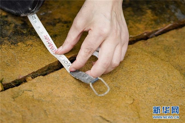7月1日,地質(zhì)災害監(jiān)測員侯芳在古家坳不穩(wěn)定斜坡地質(zhì)災害點的一條裂縫前進行測量工作。新華社記者 劉潺 攝