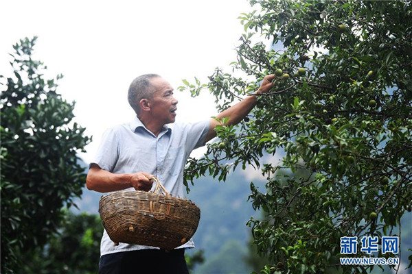 7月3日,下莊村黨支部書記毛相林在采摘脆李。當(dāng)年他曾帶領(lǐng)村民修出一條“通天路”。新華社記者王全超攝