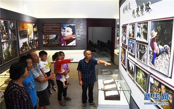 7月3日,下莊村黨支部書記毛相林(右一)在下莊精神陳列館內(nèi)講述當(dāng)年修路的故事。新華社記者王全超攝