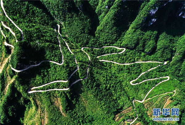 7月3日拍攝的下莊村(無人機(jī)照片)。地處秦巴山區(qū)腹地的重慶市巫山縣竹賢鄉(xiāng)下莊村被稱作“天坑村”。多年來,全村人憑借“不等不靠,幸福要自己造”的精神,走出了自己的一條幸福路。曾經(jīng),四面絕壁猶如一圈難以跨越的高墻,將下莊人緊緊困在里面。閉塞的交通束縛了人們掙脫貧困和封閉的雙手,阻擋著全村通向文明和富裕的腳步。不甘心“坐井觀天”的下莊人,用生命挑戰(zhàn)懸崖,村民拿著鐵釬和鐵錘,在懸崖上鑿出一條“通天路”,徹底改變了村莊的命運(yùn)。當(dāng)?shù)卣群髮ο虑f村的道路進(jìn)行了加寬、硬化加固,并加裝了護(hù)欄。如今,從下莊出發(fā)到縣城的時間縮短到一個半小時左右。通路后,村里的面貌很快發(fā)生了變化。2015年,下莊村完成整村脫貧。如今,下莊村建立了果蔬種植合作社,巫山縣在這里建立了下莊精神陳列館,建成了風(fēng)貌統(tǒng)一的鄉(xiāng)村民宿,幫助下莊村發(fā)展生態(tài)文旅產(chǎn)業(yè)。曾經(jīng)的“天坑村”靠著自強(qiáng)不息的精神,道路越走越寬。新華社記者王全超攝