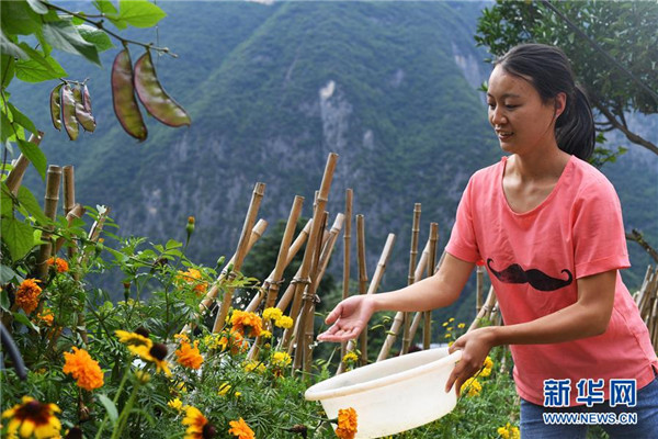 7月3日,26歲的下莊村村民龍?jiān)圃谧约以鹤永锝o花澆水。新華社記者王全超攝