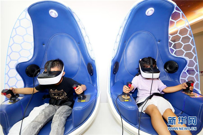 7月12日,小學(xué)生在山東省青島市即墨區(qū)環(huán)秀街道濱湖社區(qū)科普館進(jìn)行VR體驗(yàn)活動(dòng)。新華社發(fā)(梁孝鵬 攝)