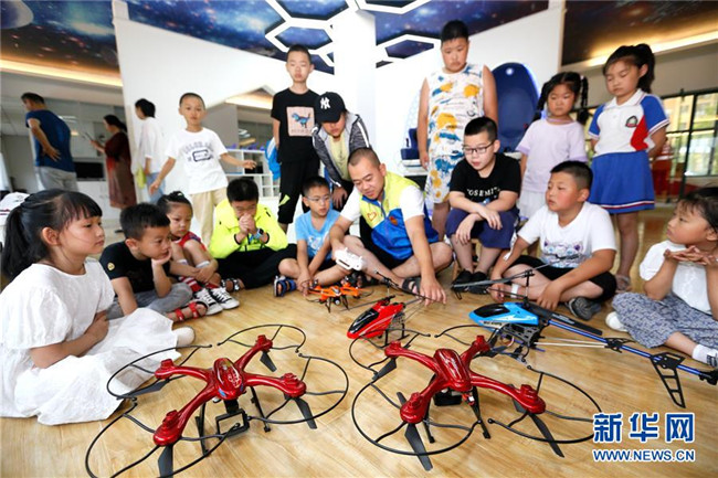7月12日,山東省青島市即墨區(qū)環(huán)秀街道濱湖社區(qū)科普館工作人員在給小學(xué)生講解無(wú)人機(jī)飛行常識(shí)。新華社發(fā)(梁孝鵬 攝)