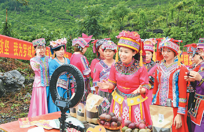 7月11日,廣西羅城仫佬族自治縣“仫佬十姐妹”直播團(tuán)隊在四把鎮(zhèn)集環(huán)村介紹當(dāng)?shù)剞r(nóng)特產(chǎn)品,通過電商直播“帶貨”,助力脫貧攻堅。韋如代攝(人民視覺)