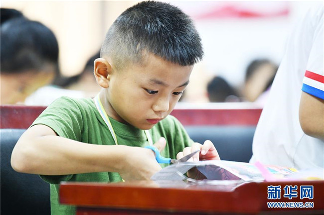 8月13日,貴州省思南縣雙塘街道麗景社區(qū)易地扶貧搬遷安置點的孩子在學習剪紙。 新華社記者 楊文斌 攝