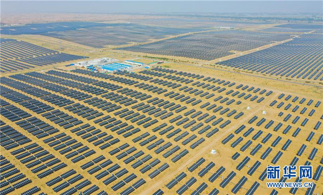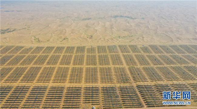 日前,由中建中環(huán)工程有限公司承建的內(nèi)蒙古達(dá)拉特旗光伏發(fā)電領(lǐng)跑獎(jiǎng)勵(lì)基地1號(hào)項(xiàng)目順利建成完工,該項(xiàng)目位于庫(kù)布其沙漠中,建成后與基地內(nèi)一期光伏電站連成一體,占地面積約120萬(wàn)平方米。 新華社記者 連振 攝