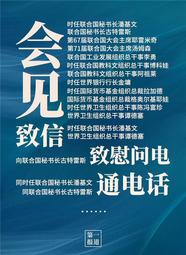 2013年以來,習(xí)主席通過會見、通話、致信函等多種方式同聯(lián)合國主要官員保持密切溝通?;訉ο蟀?lián)合國秘書長、聯(lián)合國大會主席,還有聯(lián)合國工業(yè)發(fā)展組織、聯(lián)合國教科文組織、世界銀行、國際貨幣基金組織、世界衛(wèi)生組織等聯(lián)合國專門機(jī)構(gòu)主要負(fù)責(zé)人。