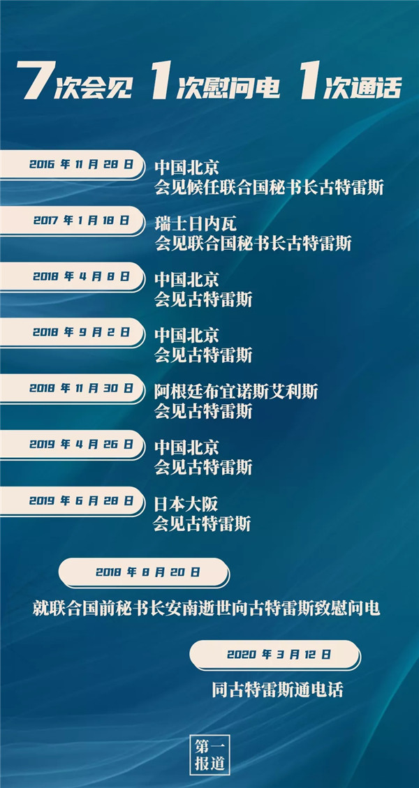 其中,習(xí)主席同聯(lián)合國“掌門人”的交往互動最為頻繁,截至目前,習(xí)主席已7次會見聯(lián)合國秘書長古特雷斯。今年,在全球暴發(fā)新冠疫情的特殊情況下,習(xí)主席還通過“電話外交”同古特雷斯保持溝通交流:
