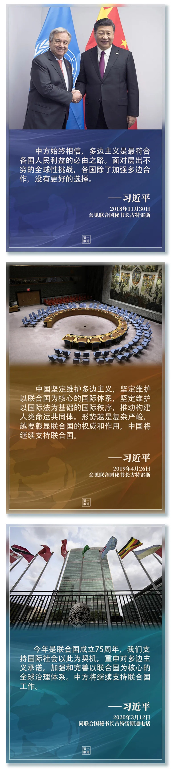 習(xí)主席指出,“支持聯(lián)合國發(fā)揮作用,維護(hù)聯(lián)合國權(quán)威和地位,是中國外交一項(xiàng)基本政策。”2013年以來,習(xí)主席多次會見聯(lián)合國主要官員,訪問聯(lián)合國總部及聯(lián)合國專門機(jī)構(gòu),出席一系列聯(lián)合國活動……親自推動中國同聯(lián)合國的合作,發(fā)出支持聯(lián)合國事業(yè)、捍衛(wèi)多邊主義的中國強(qiáng)音。