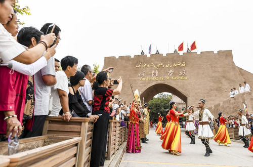 在新疆喀什古城景區(qū)“開(kāi)城”儀式上,游客在觀看歌舞表演(2019年8月13日攝)。新華社記者 王菲 攝