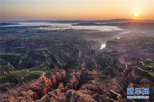 一輪紅日照耀著靖邊縣龍洲鎮(zhèn)波浪谷丹霞景區(qū)(9月24日攝,無(wú)人機(jī)照片)。新華社記者 陶明 攝