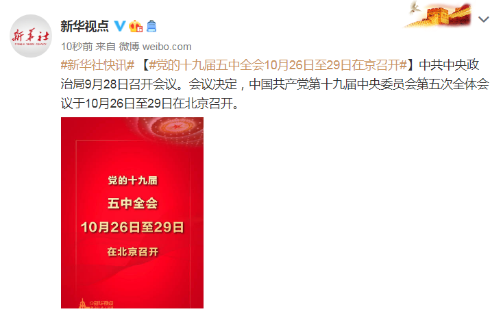 中共中央政治局9月28日召開會議。會議決定,中國共產(chǎn)黨第十九屆中央委員會第五次全體會議于10月26日至29日在北京召開。