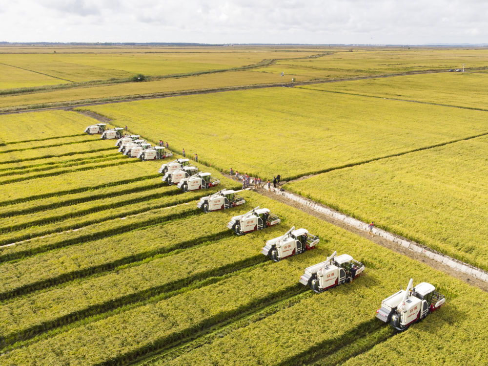 9月22日在黑龍江省富錦市萬(wàn)畝水稻公園內(nèi)拍攝的開(kāi)鐮儀式現(xiàn)場(chǎng)(無(wú)人機(jī)照片)。新華社發(fā)(張濤攝)