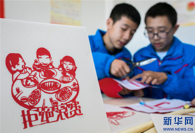 15日,內(nèi)蒙古呼和浩特市第二十六中學(xué)學(xué)生制作以“世界糧食日”為主題的剪紙作品。新華網(wǎng)發(fā)(丁根厚攝)