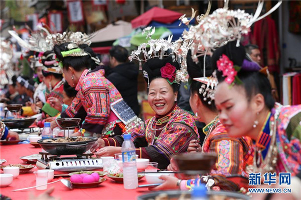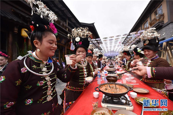10月18日,苗族群眾在貴州省丹寨縣萬(wàn)達(dá)小鎮(zhèn)吃新節(jié)長(zhǎng)桌宴上品嘗佳肴。當(dāng)日,貴州省黔東南苗族侗族自治州丹寨縣萬(wàn)達(dá)小鎮(zhèn)舉辦苗族吃新節(jié)體驗(yàn)活動(dòng)。當(dāng)?shù)孛缱逋J笙舞、品長(zhǎng)桌宴,并邀請(qǐng)游客參與其中,大家在歡聲笑語(yǔ)中樂(lè)享金秋。新華社發(fā)(凱尚宇攝)