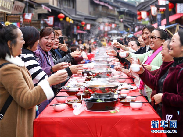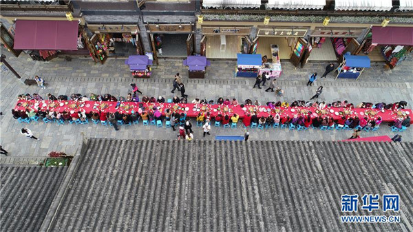 10月18日,游客在貴州省丹寨縣萬(wàn)達(dá)小鎮(zhèn)吃新節(jié)長(zhǎng)桌宴上品嘗佳肴。當(dāng)日,貴州省黔東南苗族侗族自治州丹寨縣萬(wàn)達(dá)小鎮(zhèn)舉辦苗族吃新節(jié)體驗(yàn)活動(dòng)。當(dāng)?shù)孛缱逋J笙舞、品長(zhǎng)桌宴,并邀請(qǐng)游客參與其中,大家在歡聲笑語(yǔ)中樂(lè)享金秋。新華社發(fā)(陸德華攝)