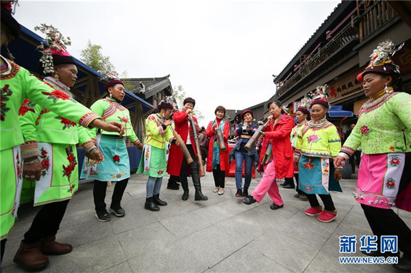 10月18日,游客在貴州省丹寨縣萬(wàn)達(dá)小鎮(zhèn)吃新節(jié)上體驗(yàn)苗族傳統(tǒng)蘆笙舞。當(dāng)日,貴州省黔東南苗族侗族自治州丹寨縣萬(wàn)達(dá)小鎮(zhèn)舉辦苗族吃新節(jié)體驗(yàn)活動(dòng)。當(dāng)?shù)孛缱逋J笙舞、品長(zhǎng)桌宴,并邀請(qǐng)游客參與其中,大家在歡聲笑語(yǔ)中樂(lè)享金秋。新華社發(fā)(黃曉海攝)