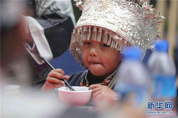 10月18日,一名小朋友在貴州省丹寨縣萬(wàn)達(dá)小鎮(zhèn)吃新節(jié)長(zhǎng)桌宴上品嘗佳肴。當(dāng)日,貴州省黔東南苗族侗族自治州丹寨縣萬(wàn)達(dá)小鎮(zhèn)舉辦苗族吃新節(jié)體驗(yàn)活動(dòng)。當(dāng)?shù)孛缱逋J笙舞、品長(zhǎng)桌宴,并邀請(qǐng)游客參與其中,大家在歡聲笑語(yǔ)中樂(lè)享金秋。新華社發(fā)(張暉攝)