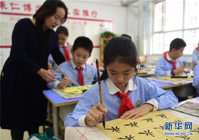 10月20日,滄州市實驗小學參加“校內(nèi)課后延時服務(wù)”的學生在老師的指導下練習書法。