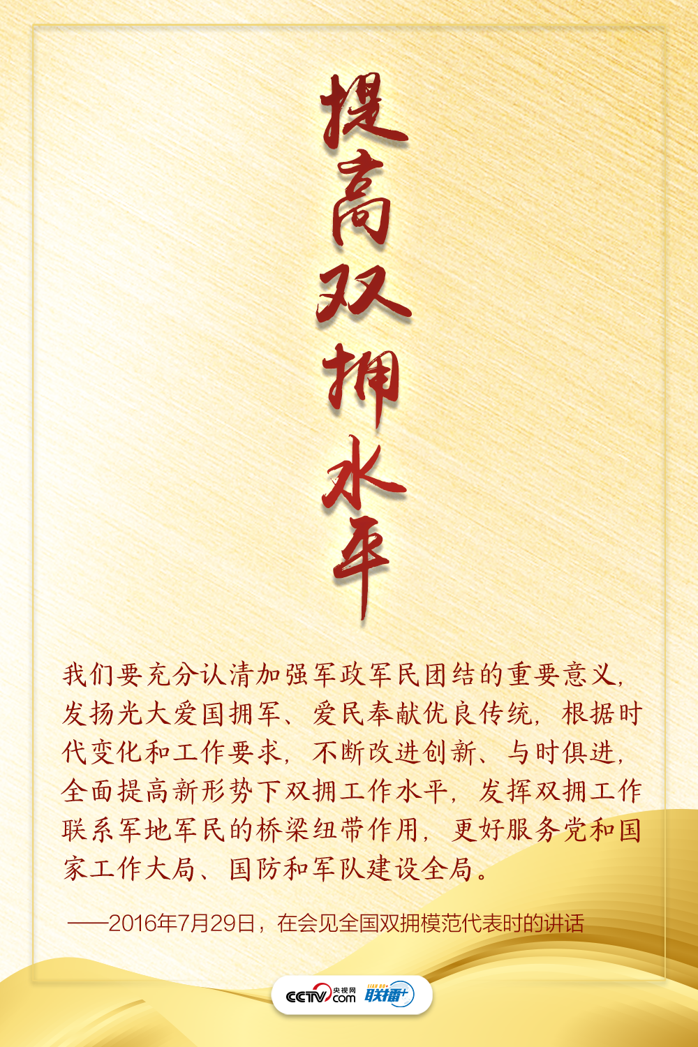 習(xí)近平總書(shū)記始終高度重視雙擁工作,多次在重要會(huì)議、國(guó)內(nèi)考察時(shí)親力親為指導(dǎo)推動(dòng)。他強(qiáng)調(diào)擁軍優(yōu)屬、擁政愛(ài)民是我黨我軍特有的政治優(yōu)勢(shì),堅(jiān)如磐石的軍政軍民關(guān)系是我們戰(zhàn)勝一切艱難險(xiǎn)阻、不斷從勝利走向勝利的重要法寶。