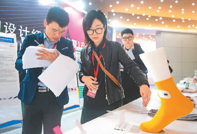 日前,中國設計紅星獎(諸暨)產品設計大賽在浙江省諸暨市開啟現場實物評審。為推動襪業(yè)“設計+科技”的創(chuàng)新,今年的主題聚焦襪業(yè),共有387件擁有外觀設計專利的作品入圍實物終評。江 漢攝(新華社發(fā))