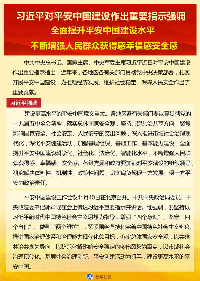 習(xí)近平強(qiáng)調(diào),建設(shè)更高水平的平安中國意義重大。各地區(qū)各有關(guān)部門要認(rèn)真貫徹黨的十九屆五中全會精神,落實(shí)總體國家安全觀,堅(jiān)持共建共治共享方向,聚焦影響國家安全、社會安定、人民安寧的突出問題,深入推進(jìn)市域社會治理現(xiàn)代化,深化平安創(chuàng)建活動,加強(qiáng)基層組織、基礎(chǔ)工作、基本能力建設(shè),全面提升平安中國建設(shè)科學(xué)化、社會化、法治化、智能化水平,不斷增強(qiáng)人民群眾獲得感、幸福感、安全感。各級黨委和政府要加強(qiáng)對平安建設(shè)的組織領(lǐng)導(dǎo),研究解決體制性、機(jī)制性、政策性問題,切實(shí)肩負(fù)起促一方發(fā)展、保一方平安的政治責(zé)任。