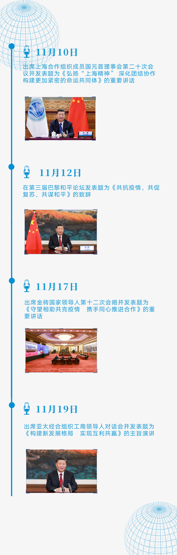 11月10日至22日,不到兩周時(shí)間,習(xí)主席以視頻方式出席4場(chǎng)多邊會(huì)議、一場(chǎng)國際論壇,發(fā)表8場(chǎng)重要講話、主旨演講和致辭,外交日程異常密集。