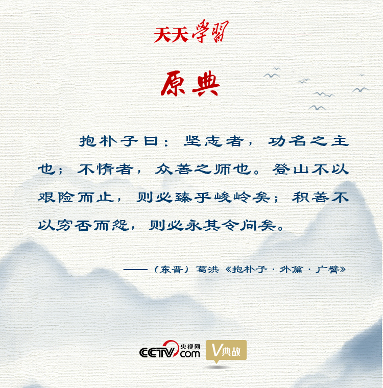 在《外篇·廣譬》中,葛洪提出:“堅(jiān)志者,功名之主也;不惰者,眾善之師也。登山不以艱險(xiǎn)而止,則必臻乎峻嶺矣;積善不以窮否而怨,則必永其令問矣。”意思是意志堅(jiān)定,是建功立業(yè)的主導(dǎo);勤奮不怠,是一切善行的老師。登山不因?yàn)槠D難險(xiǎn)阻而停止,就一定會(huì)到達(dá)頂峰;行善不因?yàn)樽陨砀F困與否而埋怨,就一定會(huì)使自己的美譽(yù)長久。用登山作譬,指出意志堅(jiān)定和勤奮不怠是事業(yè)成功的重要保證。