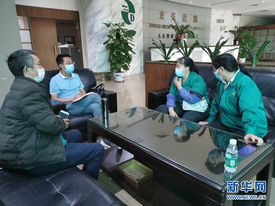 鎮(zhèn)雄縣駐廣東省東莞市清溪鎮(zhèn)勞務(wù)輸出工作站站長(zhǎng)張勇(左二)在清溪鎮(zhèn)一家企業(yè)走訪鎮(zhèn)雄籍務(wù)工人員(4月24日攝)。新華社發(fā)
